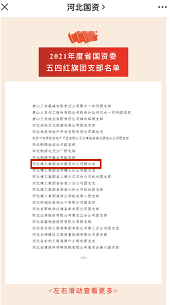 5月上旬,喜讯传来!五分公司团总支受到河北省国资委团委、省国资委青联联合表彰,被评为“2021年度河北省国资委五四红旗团支部”。