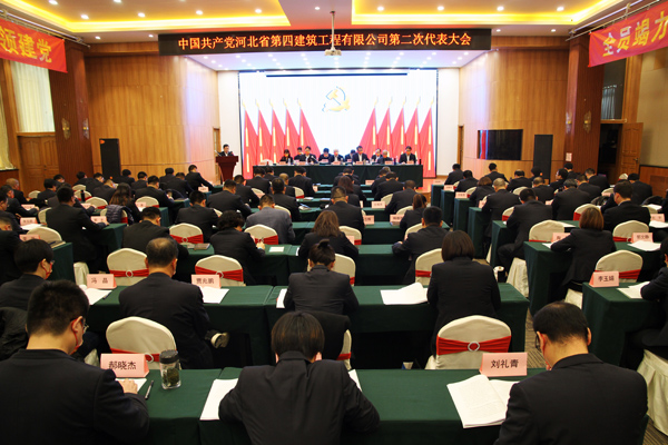 12月3日正午,石家庄市利淳商务酒店大型会议室。主席台上金色的党徽在十面红旗的簇拥下显得格外耀眼夺目,会场两侧悬挂着“党建领航,优质高效大发展高歌猛进;全员竭力,做优做强省四建前程似锦”的标语,既精辟概括了公司党委过去五年领导发展的经验,更明确宣示了踏上新征程的坚守和依靠。会场后方正对着主席台,五根朱红色方柱上一条“解放思想、 大胆创新,凝神聚力、加快转型,为再创河北四建新辉煌而努力奋斗!”长幅标语,向2000名职工吹响了奋进的号角。